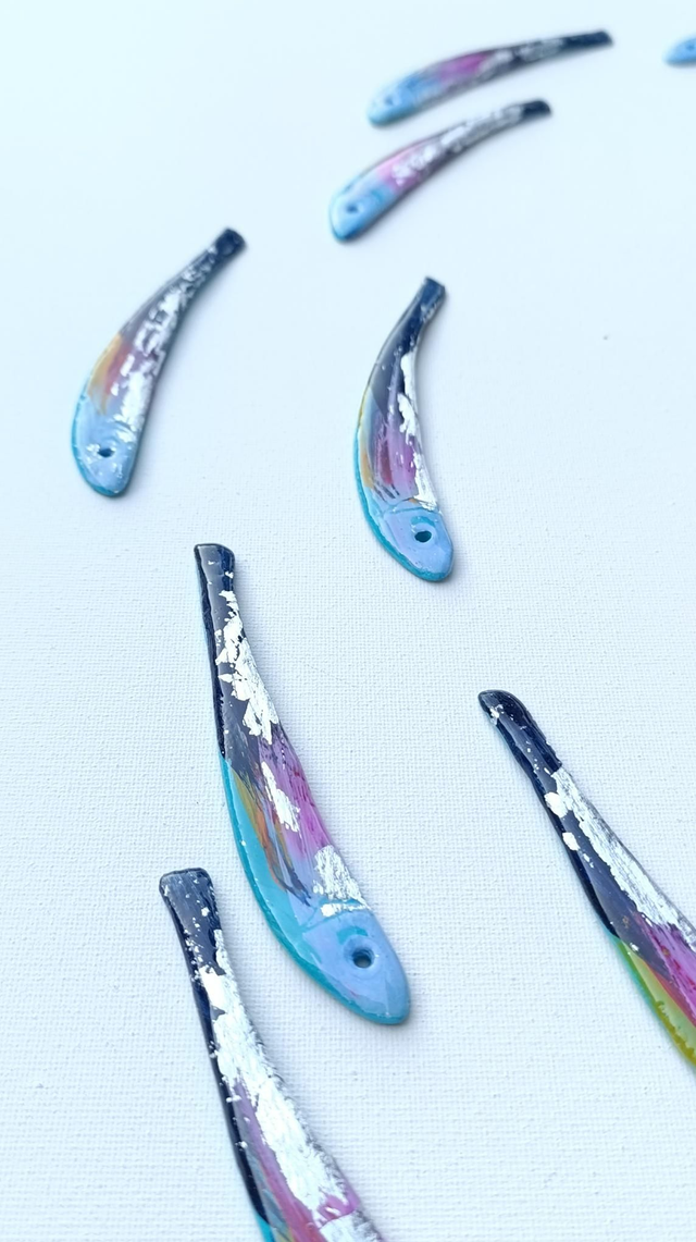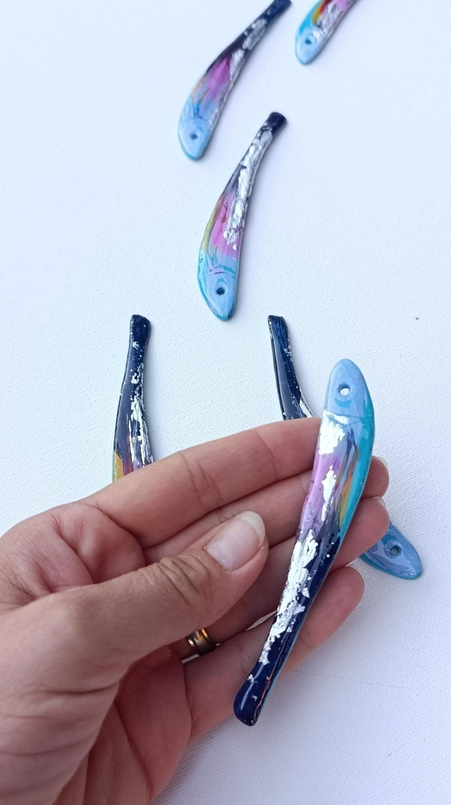 Each anchovie is hand painted and coated in resin.
